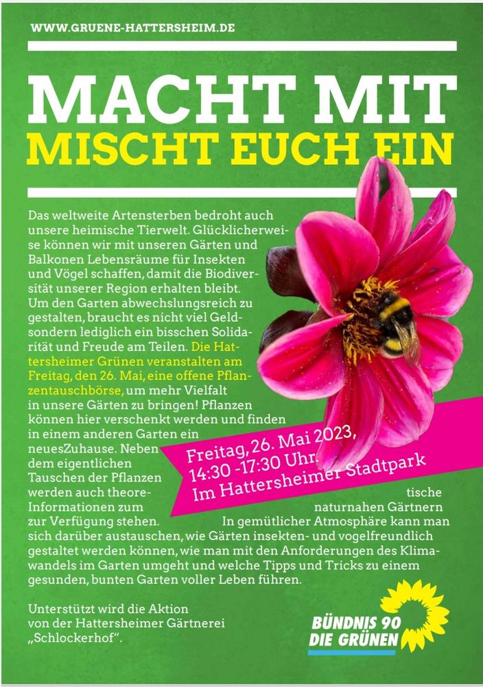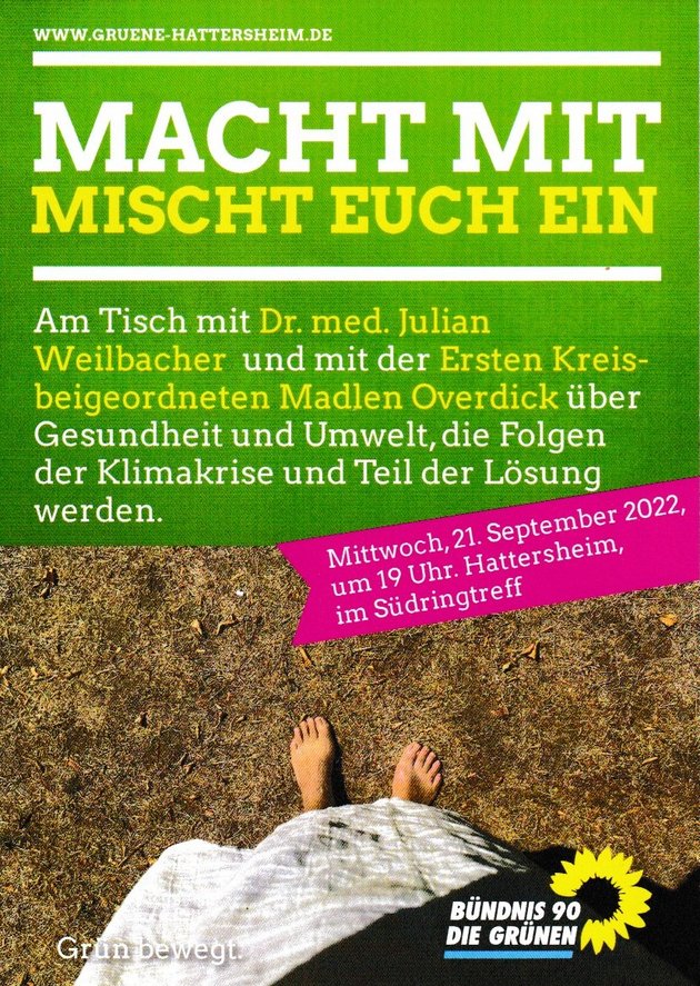 Die Hattersheimer Grünen setzen weiterhin auf Aufklärung. Die Bürgerinnen und Bürger müssen über die Auswirkungen der aktuellen klimapolitischen Entwicklungen informiert werden. Nur gemeinsam können tragfähige Lösungen erarbeitet werden, die dann auch die notwendige Akzeptanz finden.