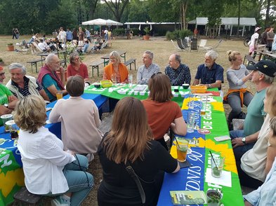 Über Eddersheim fuhr die Gruppe entlang des Mains nach Flörsheim und machte Rast beim gutbesuchten „Frühstück im Park“ zu dem die GALF eingeladen hatte. Hier stand ein ernstes Thema im Mittelpunkt: die geplante Änderung des Betriebskonzepts des Frankfurter Flughafens, von der nicht nur Flörsheim, sondern auch Eddersheim und weitere Teile des Main-Taunus-Kreises zusätzlich durch Fluglärm belasten wird.